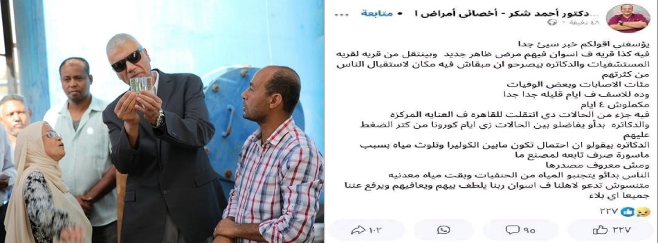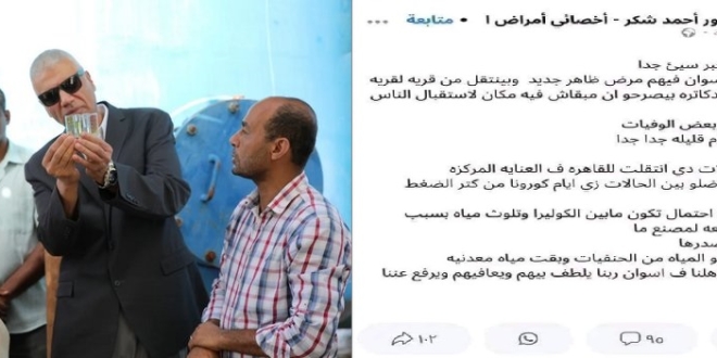 ونقلت ناشطة عن صيدلي في مستشفى في أسوان، أن الأغلب الوباء المنتشر هناك كوليرا، والأعداد تزيد وأن الوفيات بالعشرات، وأن مياه النيل ستحمل الوباء للوجه القبلي والبحري.