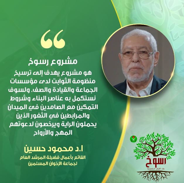 وفي كلمته حول “رسوخ” قال أ.د. محمود حسين، القائم بأعمال فضيلة المرشد العام لجماعة الإخوان المسلمين إن “رسوخ هو مشروع يهدف إلى ترسيخ منظومة الثوابت لدى مؤسسات الجماعة والقيادة والصف”.