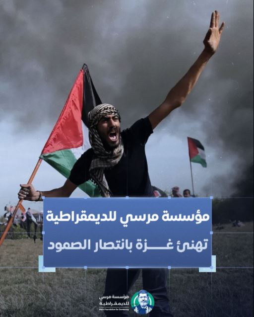 اعتبرت مؤسسة مرسي للديمقراطية أن “فرحة الشعب الفلسطيني بتوقف العدوان وانسحاب قوات الاحتلال من بعض المواقع المحتلة، بالإضافة إلى إتمام صفقة تبادل الأسرى، يعكس إنجازاً يُضاف إلى مسيرة النضال الفلسطيني، وانتصاراً معنوياً للأمة العربية وقضيتها المركزية.”.