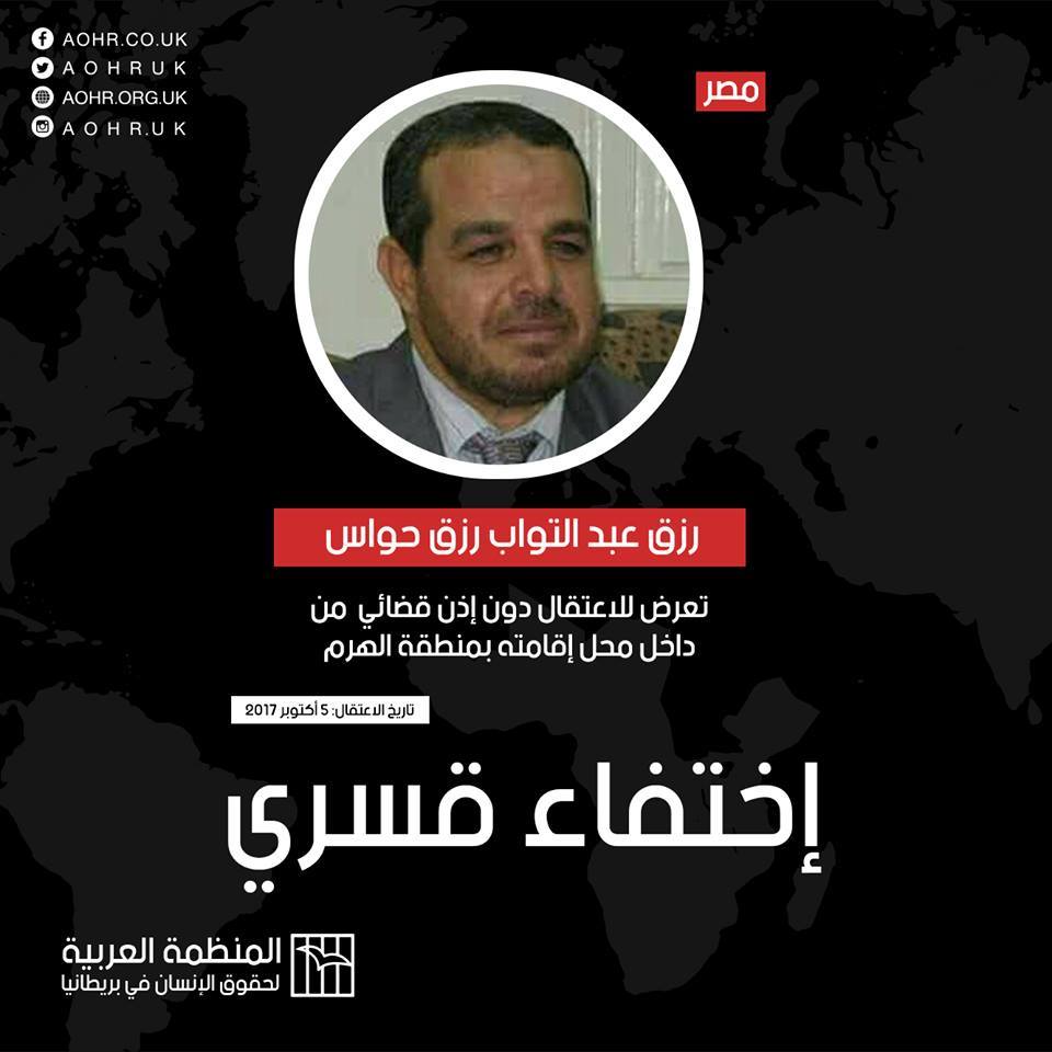 أطلق نشطاء على مواقع التواصل الاجتماعي دعوة على هاشتاج "#رزق_حواس_فين" للتضامن والتدوين لإجلاء مصير المهندس المعتقل رزق عبد التواب حواس، مرشح الإخوان السابق في انتخابات مجلس الشعب، والذي تم اعتقاله منذ يوم 5 أكتوبر الجاري، ولا يعلم أحد مكان اختطافه حتى الآن. "حواس" من أبناء مدينة البدرشين بالجيزة، ويتمتع بشعبية واسعة في جنوب الجيزة، بسبب مشاركته في كافة الأعمال العامة والدعوية خلال السنوات الماضية، منذ استقراره بمصر بعد 20 عاما من العمل بالمدينة المنورة. ويبلغ المهندس رزق حواس 55 عاما، ويعمل مهندسا مدنيا، وسبق أن شارك في عدد من المشروعات المهمة، وتعرض للاختطاف من قوات أمن الانقلاب بملابس مدنية من مقر سنه في الجيزة، دون إذن قضائي. حيث اختطفته مليشيات أمن الانقلاب لمكان مجهول، وإلى الآن لم يتم عرضه على النيابة أو إعلان مكان احتجازه. كما رفض قوات أمن الانقلاب السماح له بالتواصل مع أحد من أفراد أسرته أو محاميه. وأبرقت أسرة المهندس رزق حواس عدة بلاغات وتلغرافات للجهات المعنية بحكومة الانقلاب لإجلاء مصيره، إلا أنه تم تجاهلها جميعاً، كما أنكرت الجهات الأمنية وجوده لديها!
