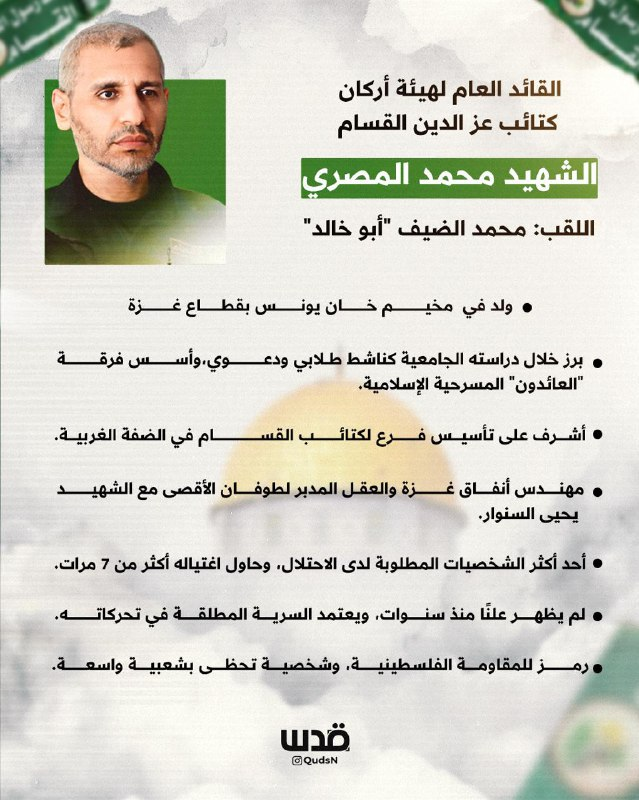 وعلق الشايجي وهو أستاذ العلوم السياسية، “.. للمرة الأولى يعترف #ابو_عبيدة الناطق باسم #كتائب_القسام .. باستشهاد القائد الميداني وقائد هيئة الأركان #محمد_الضيف أبو خالد “شهيد القمة الكبير” بعد مواجهات مع العدو الصهيوني على مدى 30 عاما .. وكان العدو الإسرائيلي أدعى في 1-8-2024.. اغتيال قائد كتائب القسام في.. خان يونس في غارة بارتكاب مجزرة بقنابل زنة الواحدة 2000 رطل-900 كلغ في13 -7-2024-أدت لاستشهاد 90 مدنيا وإصابة 300 آخرين…”.