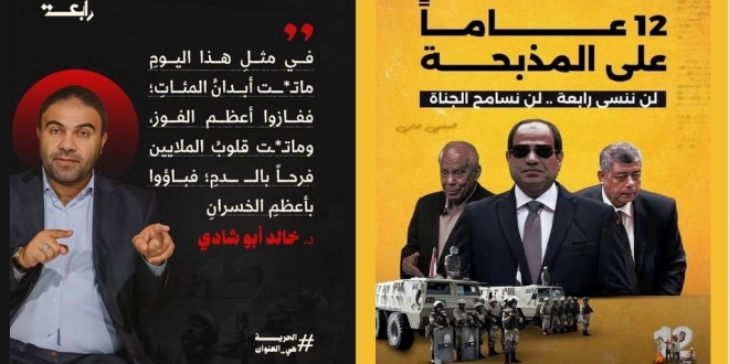 12 سنة مرت على أكبر وقائع القتل الجماعي لمتظاهرين سلميين في يوم واحد في التاريخ الحديث، وعلى قتل العسكر في مصر لزينة الرجال والشباب والنساء وبداية أسوأ حقبة قمعية في تاريخ مصر الحديث، على فض اعتصامي رابعة والنهضة السلميين بالقوة المفرطة، وعبر هاشتاجات #رابعة و#لن_ننسى_رابعة و#رابعة_لن_ننسى و#رابعة_العدوية و#رابعة_الحرية_هي_العنوان و#ذاكرة_رابعة .. وعبّر ناشطون عن أنها ستظل في الذاكرة، والدماء لم تجف لأن الأرض لا تشرب الدماء طالما بقيت بلا قصاص.