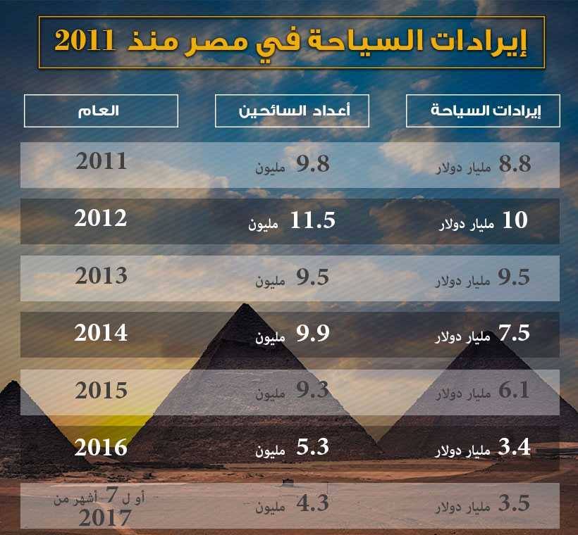 أما إيرادات عام 2013 فسجلت 9.5 مليار دولار و9.5 مليون سائح ،وإيردات السياحة فى 2014 فجاءت بـ7.5 مليار دولار و9.9 مليون سائح، و2015 جاءت بـ6.1 ملياردولار و9.3 مليون سائح، وفى عام 2016 فحلت بقيمة إيرادت بلغت 3.4 ملياردولار و5.3 مليون سائح، وأخيرا فى 2017 :3.5 مليار دولار بـ4.3 مليون سائح وذلك فى أول 7 أشهر من نفس العام الجارى.