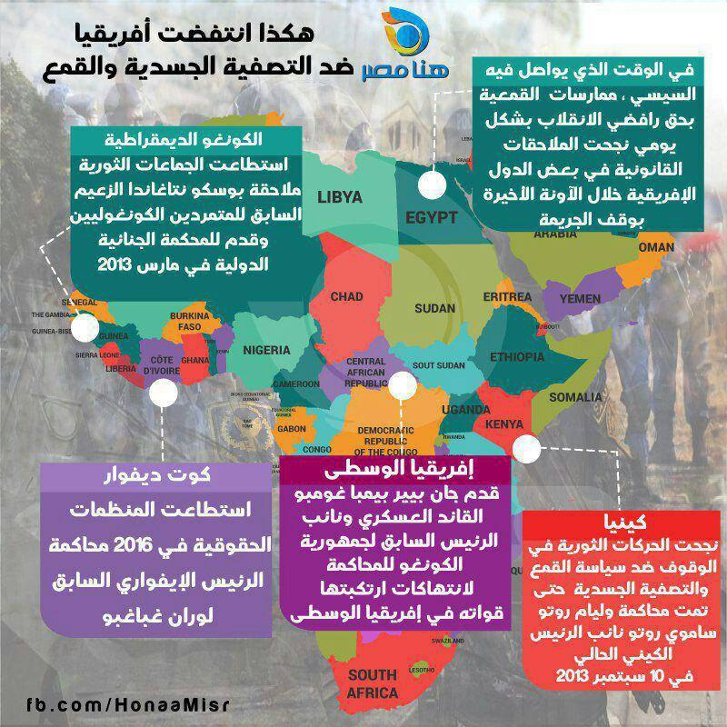 فى الوقت الذى يواصل قائد الانقلاب العسكرى عبدالفتاح السيسى ممارساته القمعية بحق رافضى الانقلاب بشكل يومى، نجحت الملاحقات القانونية ببعض الدول الإفريقية خلال الآونة الأخيرة بوقف الجريمة.