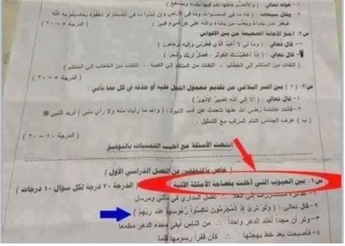 وطالب واضع الامتحان من الطلاب استخراج العيوب التي خلت بفصاحة الأية الكريمة "ولو ترى إذ المجرمون ناكسوا رؤوسهم عند ربهم"، في طعن فاضح في بلاغة القرآن الكريم، لم يجرؤ عليه أبرز عتاة الكفر في عهد النبوة أو المستشرقين وغلاة المتطرفين في العصر الحديث.