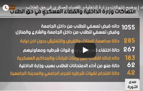 عرضت قناة "مكملين"، مساء أمس، تقرير "انفوجرافك" يوضح حجم الانتهاكات التي مارستها داخلية الانقلاب والقضاء العسكري بحق طلاب الجامعات في مصر. ووثق التقرير 1055 حالة اعتقال تعسفي للطلاب، من داخل الجامعات والشوارع والمنازل، بالإضافة إلى 255 حالة مداهمة للمنازل، والقبض والتفتيش بدون إذن نيابة. كما أكد التقرير وجود 267 حالة اختفاء قسري، على أيدي قوات شرطية ومعاونيهم، فضلاً عن 183 حالة إحالة للطلاب سواء كانوا بنين أو بنات إلى النيابات والمحاكم العسكرية، و62 حالة منع من أداء الامتحانات للطلاب بسبب وزارة الداخلية، و42 اقتحامًا لقوات شرطية للحرم الجامعي والمدنية الجامعية.
