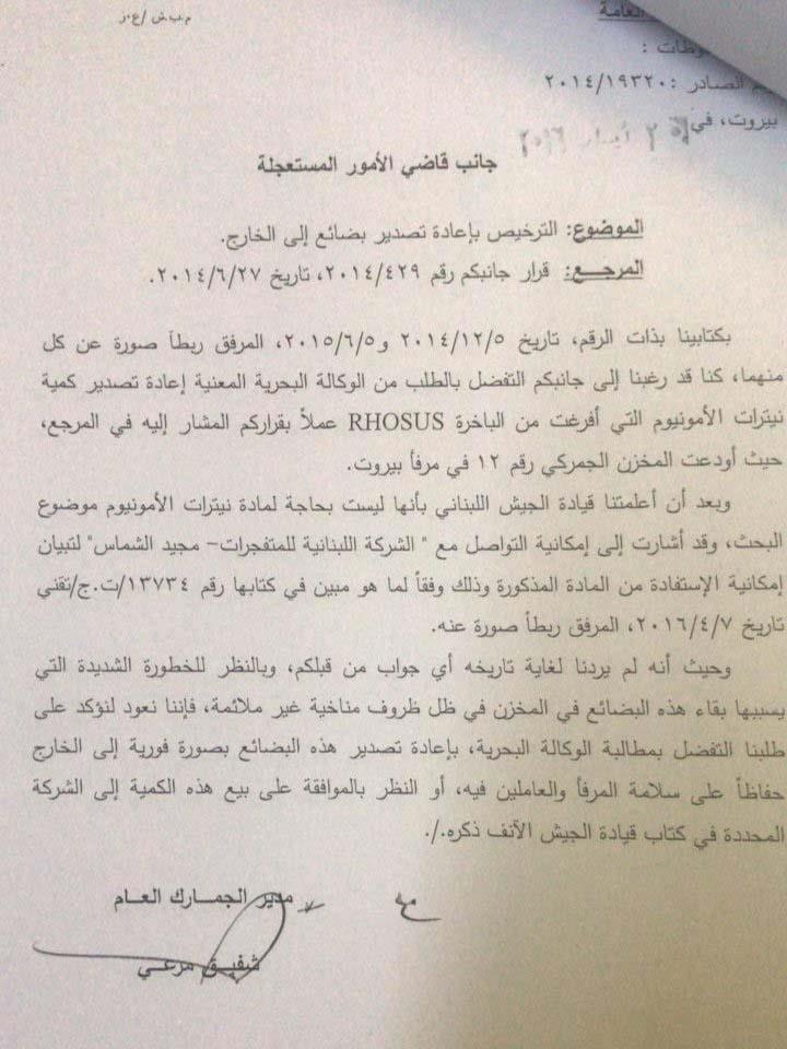 وقالت الوثيقة بعد أن لفتت إلى مراسلات سابقة: "كنا قد رغبنا إلى جانبكم التفضل بالطلب إلى الوكالة البحرية المعنية إعادة تصدير كمية من نترات الأمونيوم التي أفرغت من الباخرة RHOSUS عملا بقراركم المشار إليه في المرجع والموثق ربطا صورة عنه والتي أودعت المخزن الجمركي رقم 12 من مرفأ بيروت".