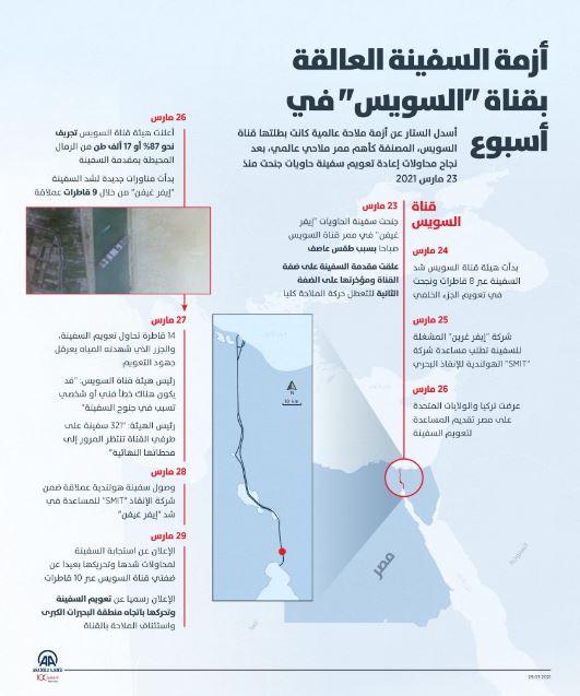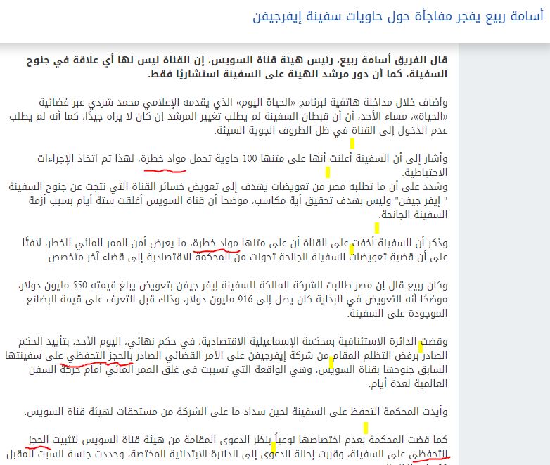 الفريق أسامة ربيع، رئيس هيئة قناة السويس، قال إن القناة ليس لها أي علاقة في جنوح السفينة، كما أن دور مرشد الهيئة على السفينة استشاري فقط. وخلال مداخلة هاتفية لبرنامج «الحياة اليوم» الذي يقدمه الإعلامي محمد شردي عبر فضائية «الحياة»، مساء الأحد، حمل ربيع السفينة المسؤولية ولكنه فيما يتعلق بحمولة السفينة التي احتوت "مواد خطرة"، ناقض ربيع نفسه فأشار إلى أن "السفينة أعلنت أنها على متنها 100 حاوية تحمل مواد خطرة، لهذا تم اتخاذ الإجراءات الاحتياطية"، ثم عاد وذكر أن "السفينة أخفت على القناة أن على متنها مواد خطرة"!