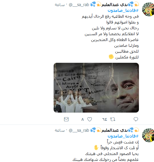 شهد هاشتاج “#قادتنا_صامدون” تفاعلًا واسعًا من جانب رواد مواقع التواصل الاجتماعي، وأشاد المغردون بصمود الرئيس محمد مرسي وقادة الإخوان والتيارات والأحزاب المناهضة للانقلاب العسكري. وكتبت ندى عبد العليم: ...