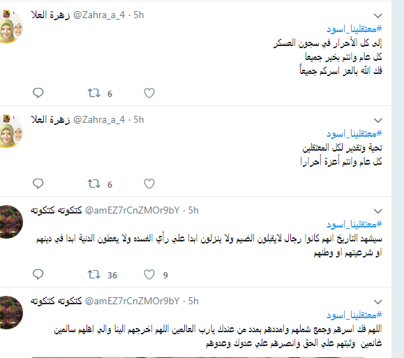 أشاد رواد موقع “تويتر” بصمود المعتقلين في سجون الانقلاب، وذلك عبر هشتاج “#معتقلينا_اسود”؛ مؤكدين أن صمودهم هو طريق الحرية للوطن. وكتبت سارة علي: “وانا ذنبي بلادي حرية وعدل ...