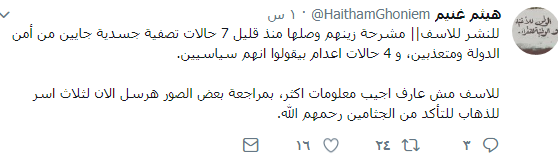 كشف الحقوقي هيثم غنيم، عن وصول جثامين 7 من ضحايا التصفية الجسدية ، منذ قليل، الي مشرحة زينهم. وكتب غنيم، عبر حسابه علي موقع تويتر، :” للاسف مشرحة ...