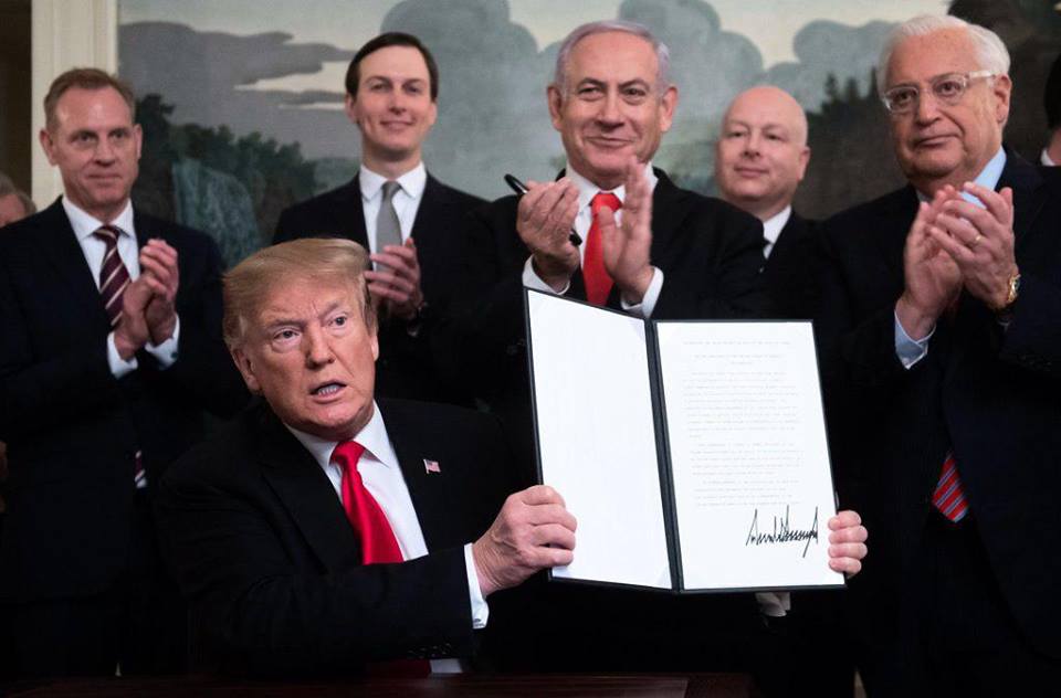 وقّع الرئيس الأمريكي دونالد ترامب، اليوم الإثنين، على مرسوم رئاسي يُقر فيه بسيادة الاحتلال الإسرائيلي على هضبة الجولان السورية المحتلة. وقال ترامب، في مؤتمر صحفي مشترك جمعه برئيس ...