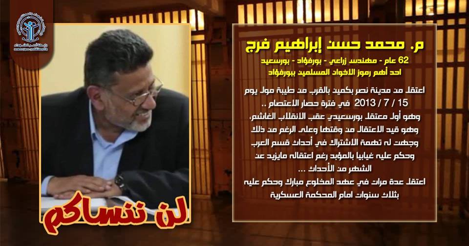 يُعد المهندس المعتقل محمد حسن إبراهيم فرج (٦٢ عامًا)، أحد أهم رموز جماعة الإخوان المسلمين بمدينة بورفؤاد بمحافظة بورسعيد. اعتقلته قوات أمن الانقلاب من مدينة نصر بكمين بالقرب ...