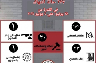 رصدت التنسيقية المصرية للحقوق والحريات، ارتكاب مليشيات الانقلاب 227 جريمة وانتهاكًا بحق المصريين خلال الأسبوع الماضي. وقالت المنظمة، في بيان لها عبر صفحتها على موقع "فيس بوك"، إنها ...