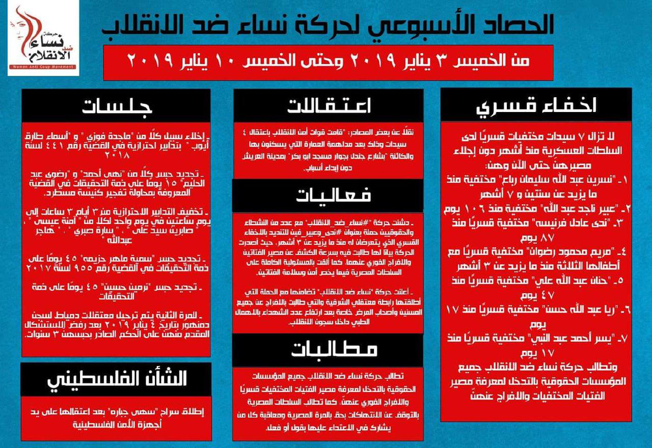 رصدت حركة “نساء ضد الانقلاب” جانبا من جرائم عصابة العسكر بحق فتيات ونساء مصر خلال الفترة من 3 إلى 10 يناير الجاري، والتي تنوعت ما بين الاعتقال والإخفاء ...