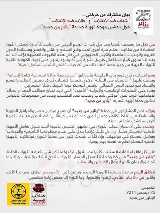 أصدرت حركتا طلاب ضد الانقلاب، وشباب ضد الانقلاب، مساء أمس، بيانًا مشتركًا، أعلنا فيه عن تدشين حملة ثورية جديدة تحت شعار "يناير من جديد"، بهدف إحياء الموجة الثانية ...