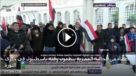 نظم أعضاء الجالية المصرية بتركيا وقفة احتجاجية بساحة مسجد السلطان محمد الفاتح، تزامنا مع الذكرى السابعة لثورة 25 يناير. وقال الدكتور طلعت فهمي، المتحدث الإعلامي باسم جماعة الإخوان ...