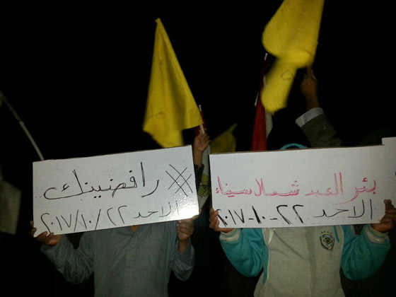 نظم ثوار بئر العبد وقفة احتجاجية مساء الأحد ضمن فعاليات أسبوع "رافضينك" الذي دعا إليه التحالف الوطني لدعم الشرعيه تنديدا بحكم العسكر وجرائمه بحق أهالي سيناء وبتردي الأوضاع ...